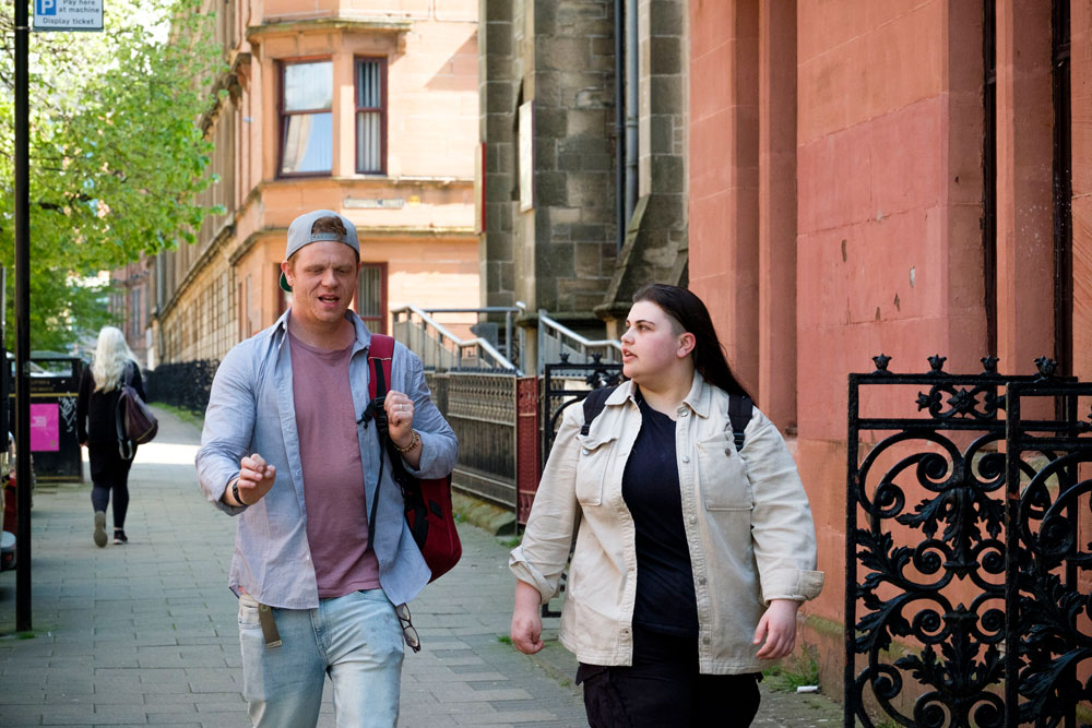 Darren McGarvey walks through Partick with BetterPod interviewer Katerina Sivitanides. Credit: Peter Byrne