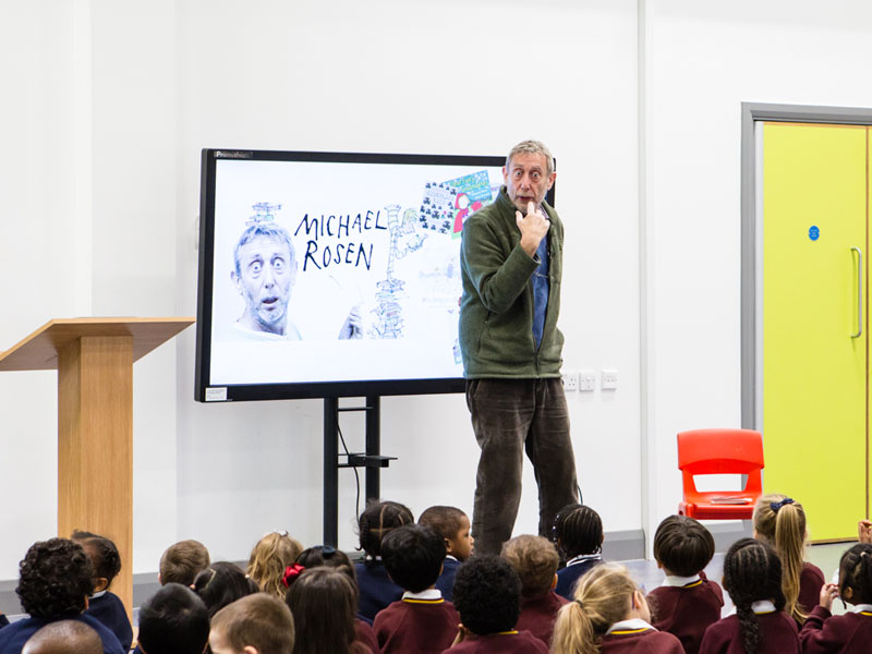 “It’s great to be here to present these books to you all!” Rosen bellows to an assembly hall of open-mouthed primary school children, thrilled to be entertained by one of the UK’s favourite kids authors.