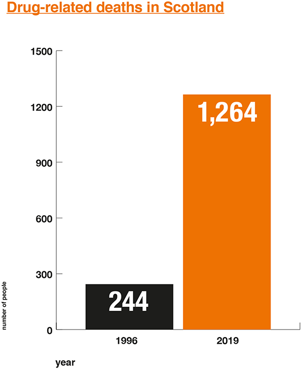 In 1996, there were 244 drug-related deaths in Scotland. In 2019, the last year figures are available, there were 1,264.