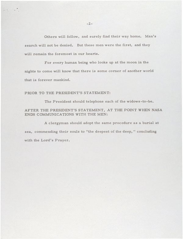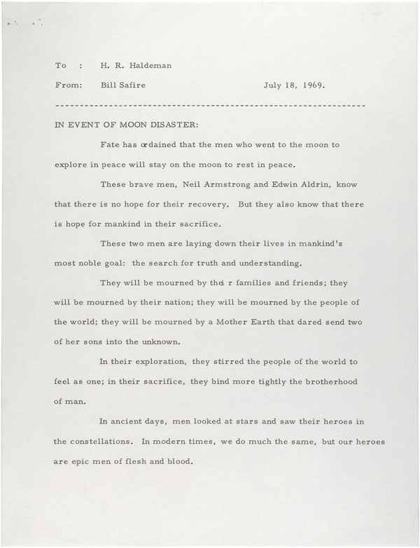 But I do actually think it’s an incredible speech as well, had it been made. It’s beautifully written, I love the title: in event of moon disaster, I love the end, where it says the president should telephone each of the widows-to-be, which I find to be quite a fascinating phrase. I love the fact that you can see the original document itself, the paper on which it was typed, because it really puts you into that window in history.