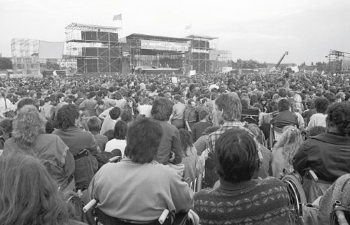 That concerts ever took place at the Radrennbahn Weißensee in north-east Berlin is difficult to envision today. Distinguished only by a wonky-looking socialist relief of some sportsmen on a wall beside the boarded-up ticket offices, the entrance to the largely derelict German Democratic Republic-era cycle track stands shrouded in graffiti, weeds and overgrown grass. The gates which once saw hundreds of thousands of excited young East Germans rushing through hang rusted and sagging on their hinges. In the corner of the field where a huge stage stood, now there’s a football pitch where some kids lazily kick a ball in the hot afternoon sun, oblivious to the dramatic events that unfolded here 30 summers ago.