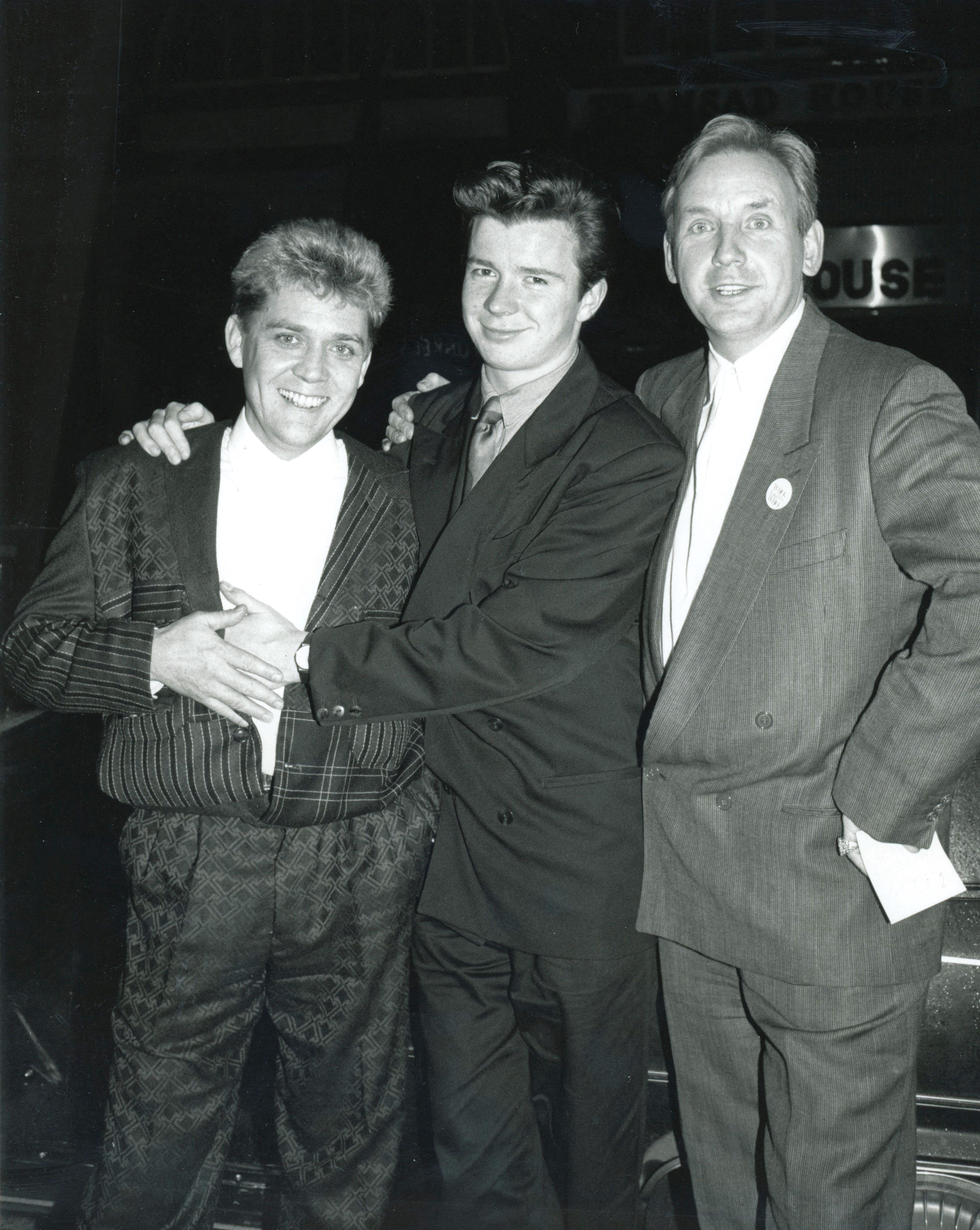 Rick Astley with Mike Stock and Pete Waterman at Stringfellows. Image: LANDMARK MEDIA / Alamy