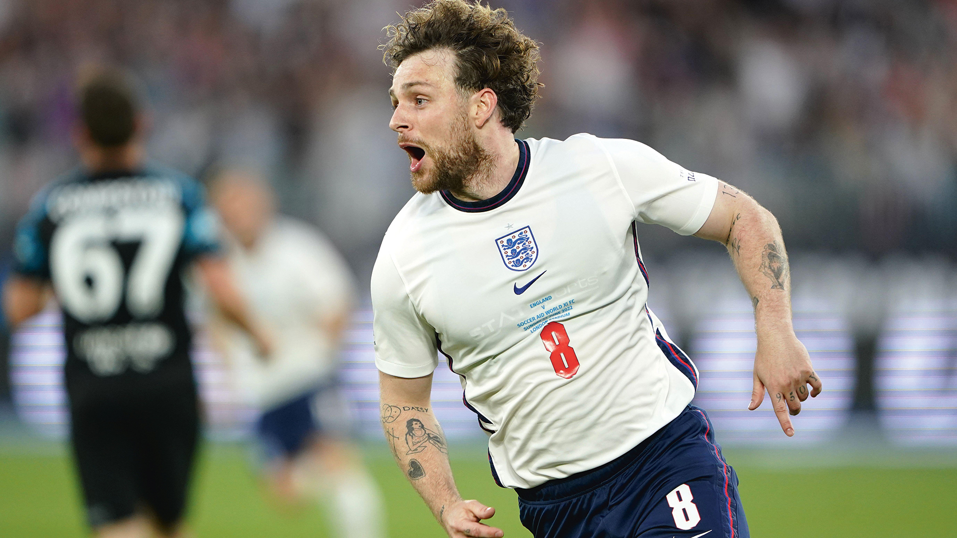 Tom Grennan playing for England at the Soccer Aid match for Unicef. Image: PA Images / Alamy Stock Photo