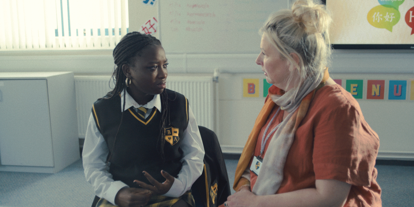 Fatima Bojang as Jade and Hannah Walters, who also played teacher Mrs Bailey. Image: Netflix