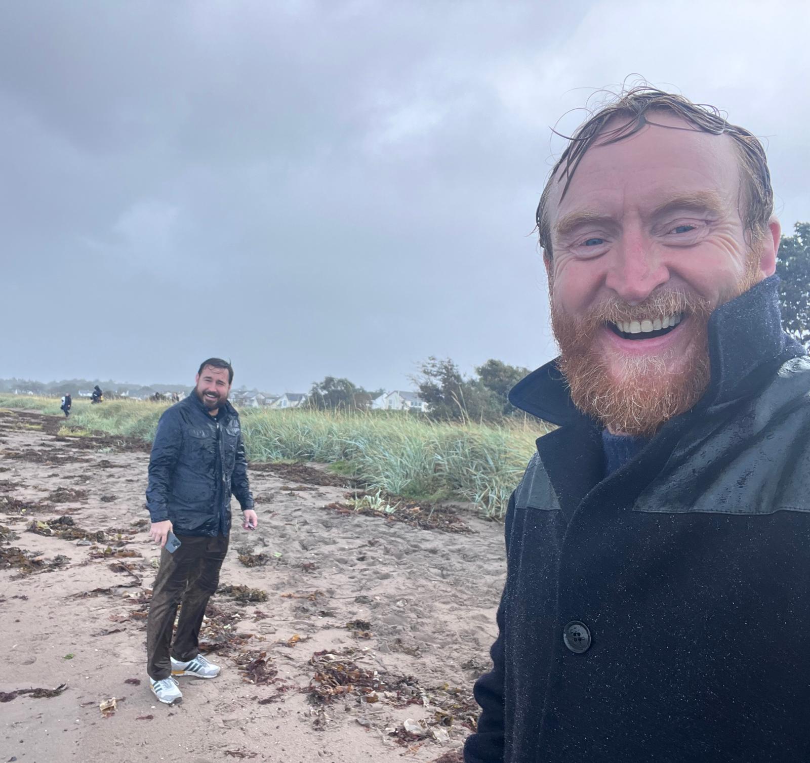 Martin Compston and Tony Curran enjoying the Scottish weather while filming on the beach. Image: Martin Compston