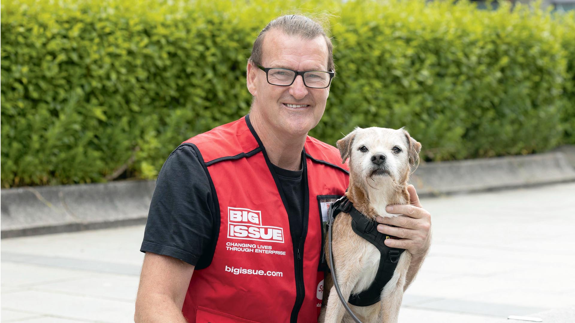 “I’ve been selling the Big Issue for nearly 20 years now,” says vendor Clive Rowe, with justifiable pride. “And Geezer here has been with me for 15 of those.” He gestures to his canine companion, a dog who’s seen almost as much of Plymouth’s streets as Clive has.