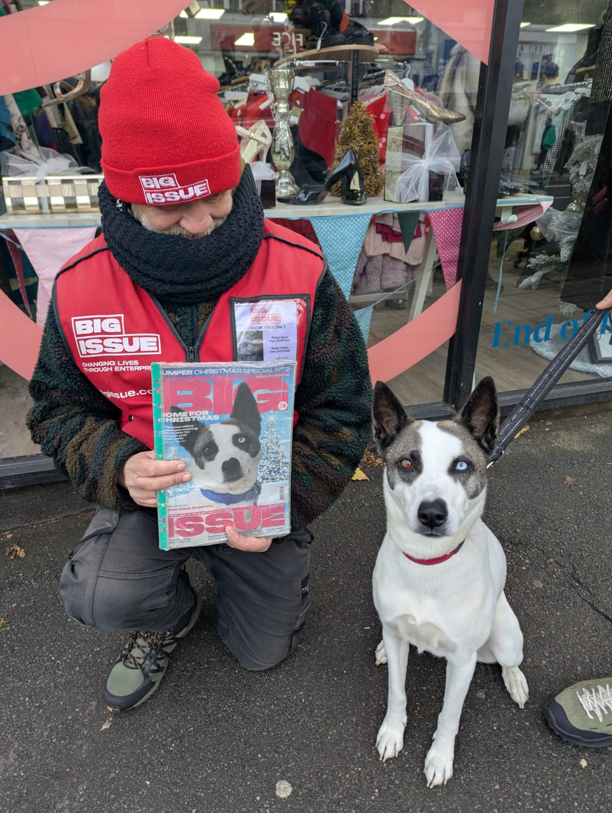 Recent cover star Iris comes face to face with her own image on the cover of Big Issue. Image: Battersea Dogs & Cats Home