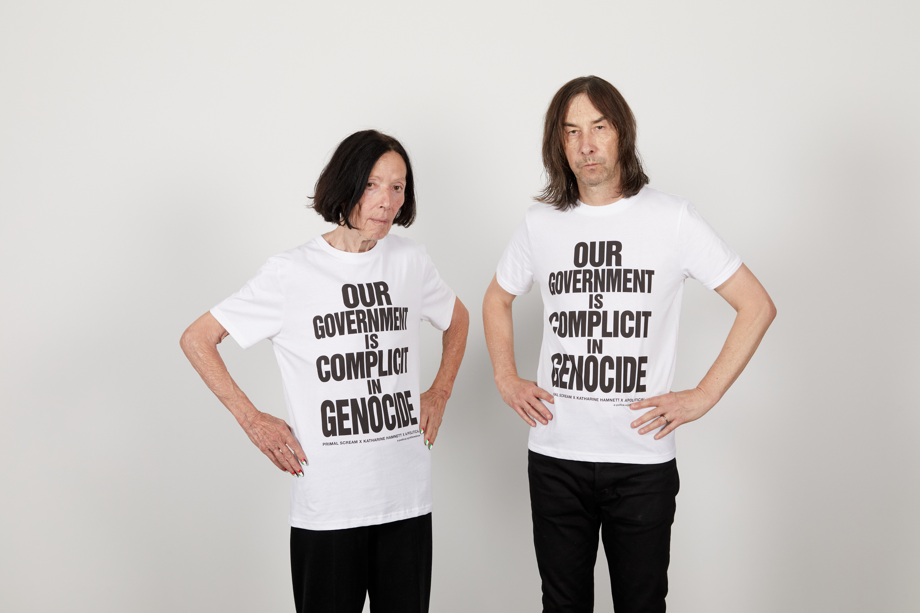 Bobby Gillespie and designer Katharine Hamnett. Image: Primal Scream x Katharine Hamnett x A/POLITICAL from END GENOCIDE. Photograph by Alastair Levy