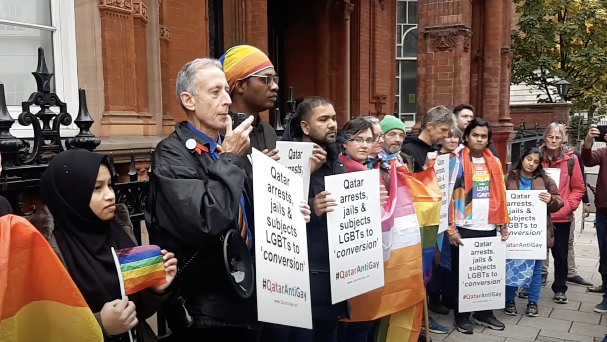 Activist Peter Tatchell leads a protest outside Qatar's embassy in London. Image: Peter Tatchell Foundation/YouTube