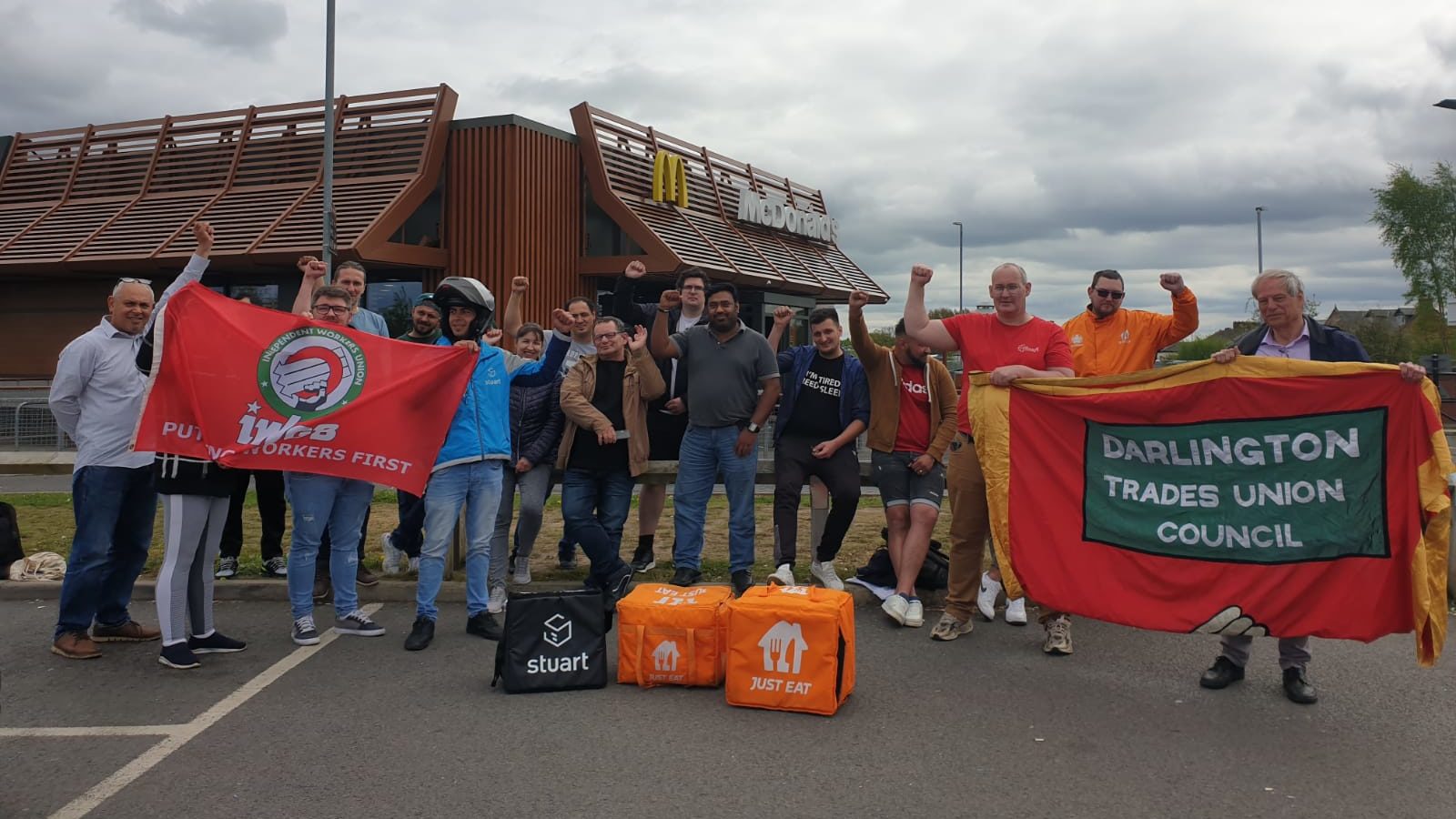 Delivery drivers for Just Eat and oursourcing company Stuart, stage a picket outside McDonald's in Darlington with the support of Darlington Trades Union Congress. Image: IWGB