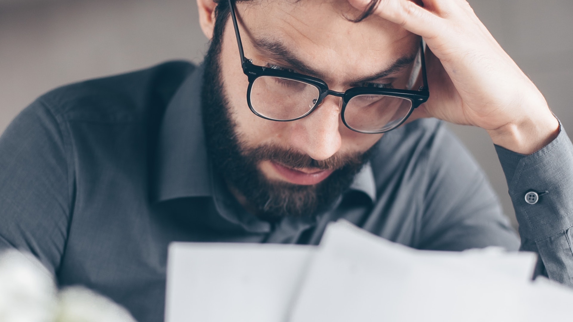 A man looking at a piece of paper with a concerned facial expression and hand on his head. More than 30 per cent of couple households with one full-time earner are in poverty, nearly as high as the rate of hardship for families without any full-time workers