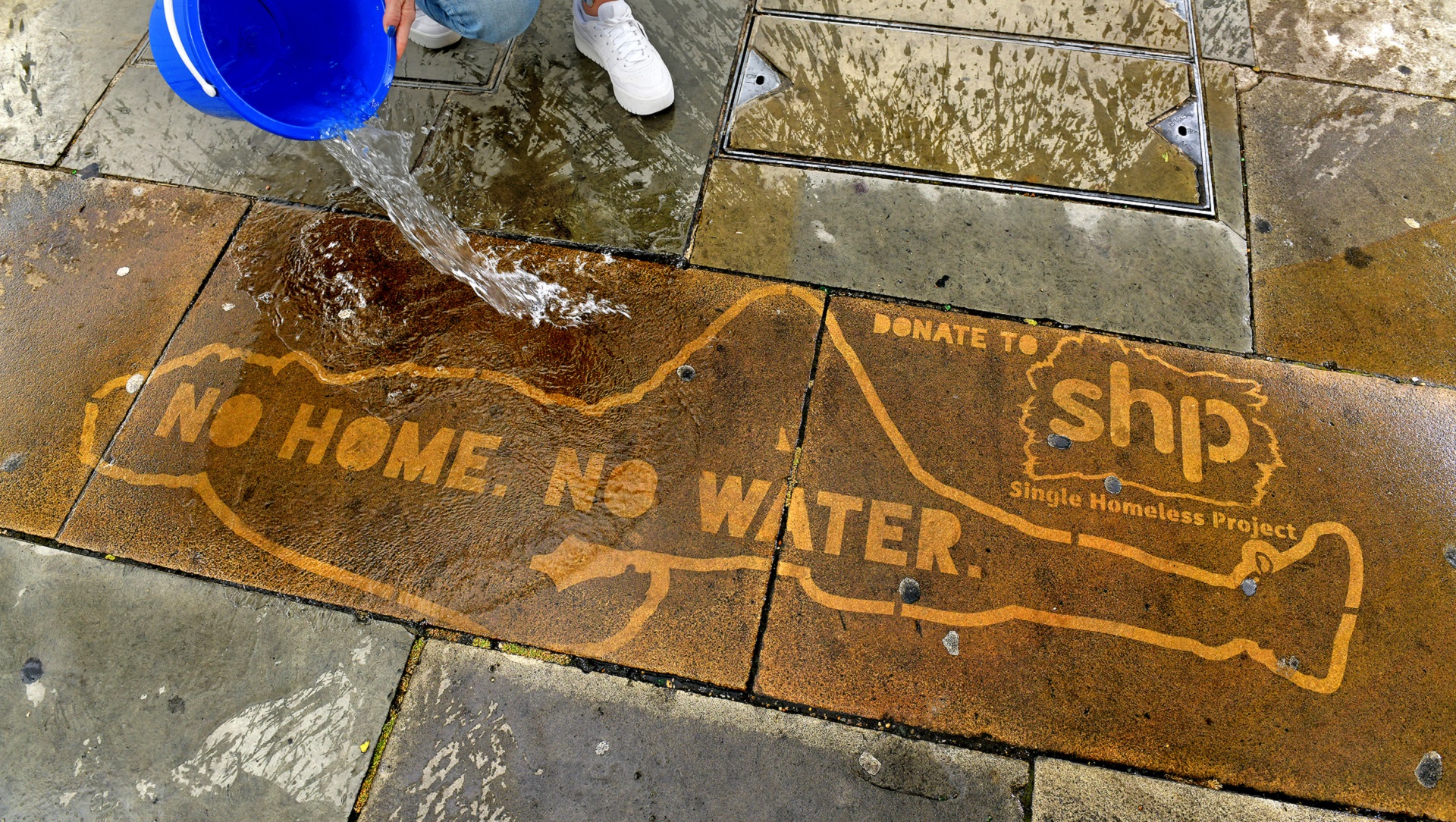 Charity Single Homeless Project (SHP) has now placed pavement artwork across the city to highlight how heat brings a risk to life. When splashed with water the art reveals the message “No Home. No Water.”