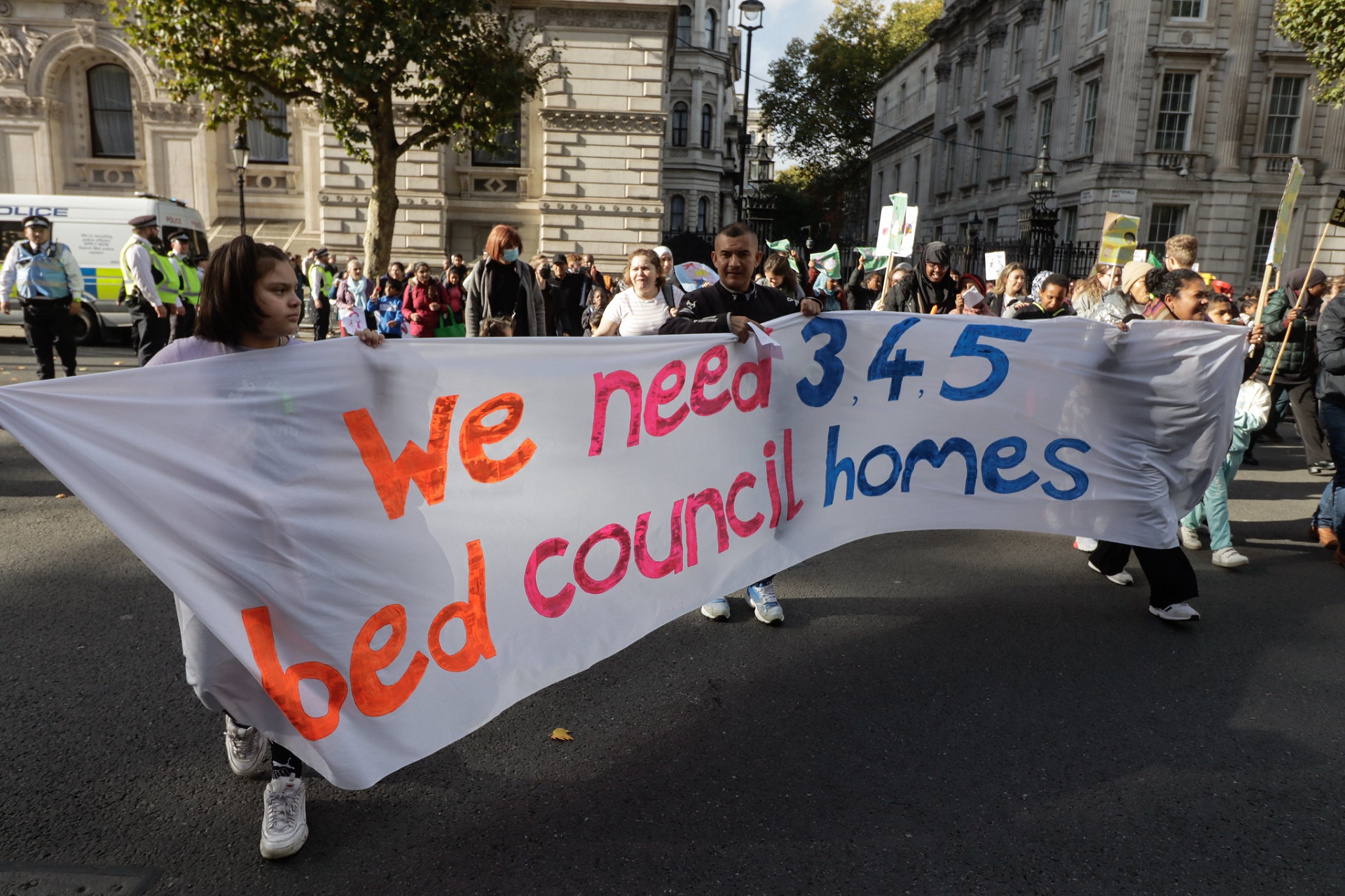 As Rishi Sunak tackled his first Prime Minister’s Questions in the Commons, parents and children from London campaign groups Housing Action Southwark and Lambeth (HASL), Haringey Housing Action Group, Focus E15, and English for Action marched from Parliament Square to Number 10.