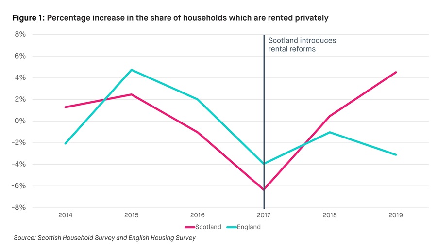 Scottish parliament effectively banned no-fault evictions and introduced greater protections for renters in 2017 but its private rented sector grew at a faster rate between March 2018 and March 2020 than England’s, the think tank said.