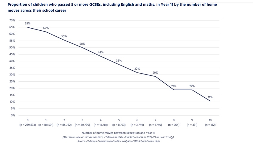 New research from Dame De Souza’s office showed just 11% of children who moved home 10 times while at school achieved five GCSEs, including England and maths, compared to 65% of children who had one home address.
