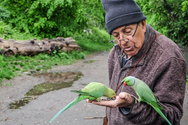 Shenan Chandler's second photo in the calendar captured a man with two parakeets. Image: Cafe Art