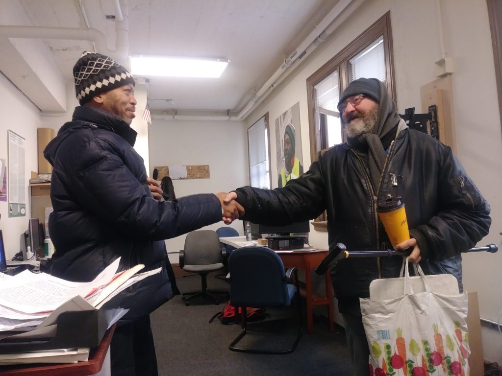 Jeffery (left) and Jeff (right) meet in the Street Sense offices in Washington DC