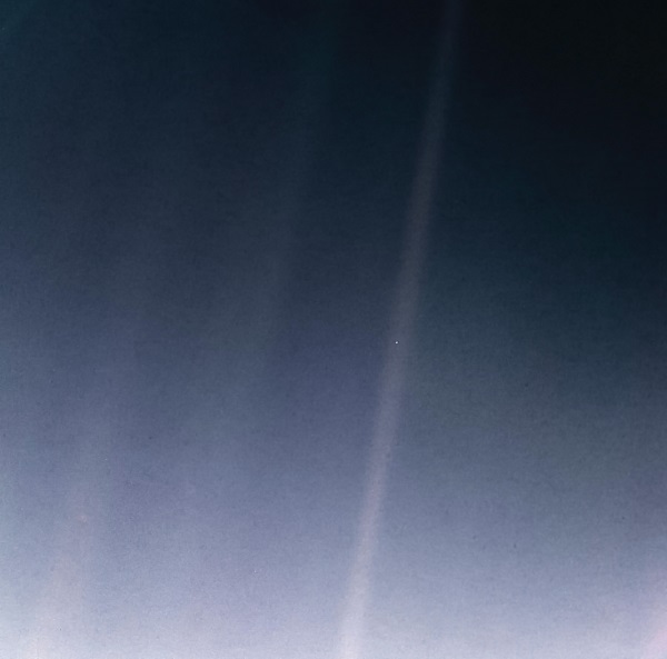 In 1977 Nasa launched the Voyager 1 space probe, and after speeding away from earth at 40,000 mph, on February 14 1990, from a record distance of about 3.7 billion miles, it took the photograph of our Earth – the pale blue dot. Of the frame here, which comprises of 640,000 pixels, it takes up only 0.12 of a pixel, it’s tiny, suspended in space, hanging on a sunbeam. It’s a grain of sand in the infinite universe, it’s our planet, our home, the only one we’ve got. We’re not going to find another, there is no lifeboat waiting for humanity, this is it, our grain of sand, our one and only world and it’s in trouble. Crisis.