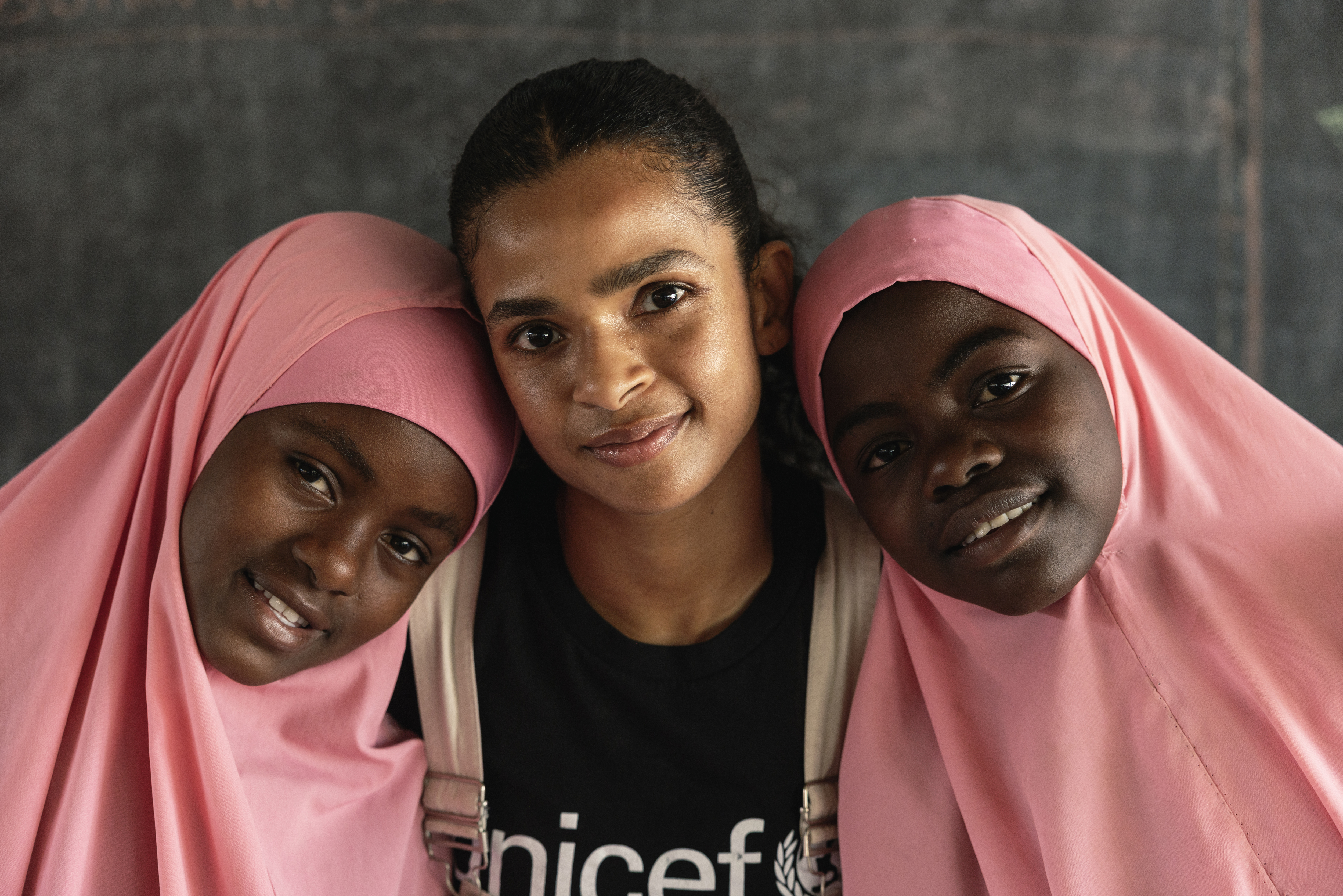 Ali with two students at Iftin Primary School in Hagadera camp, Dadaab. Image: UNICEF UK