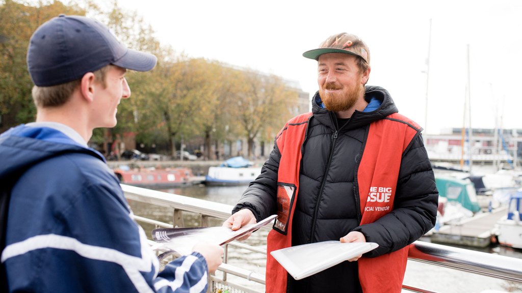 I’ve been selling the magazine here in the harbour area of Bristol for the past few months. It’s been going well. I’ve got some great customers. Some of them will buy cups of tea and coffee to keep me going, and there’s one of my customers who takes me out for a meal.